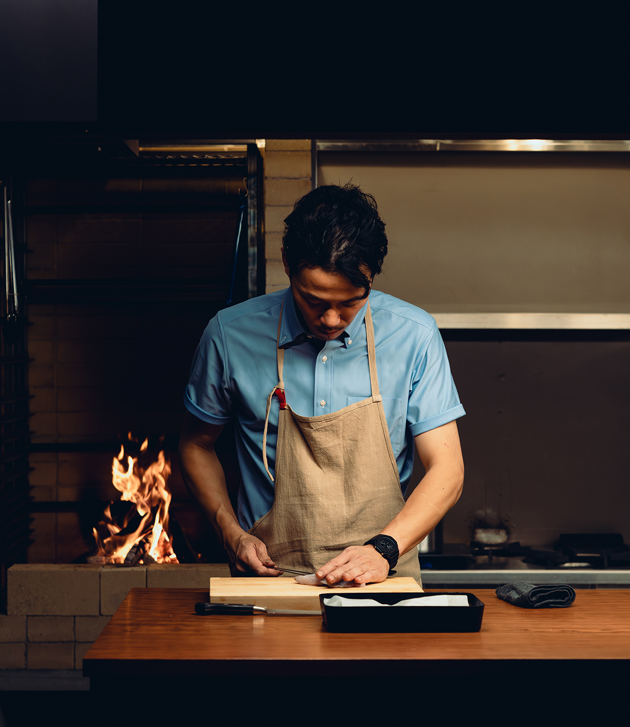 薪と炭の素朴で力強い熱が、素材の輪郭をそっと浮かび上がらせ、
